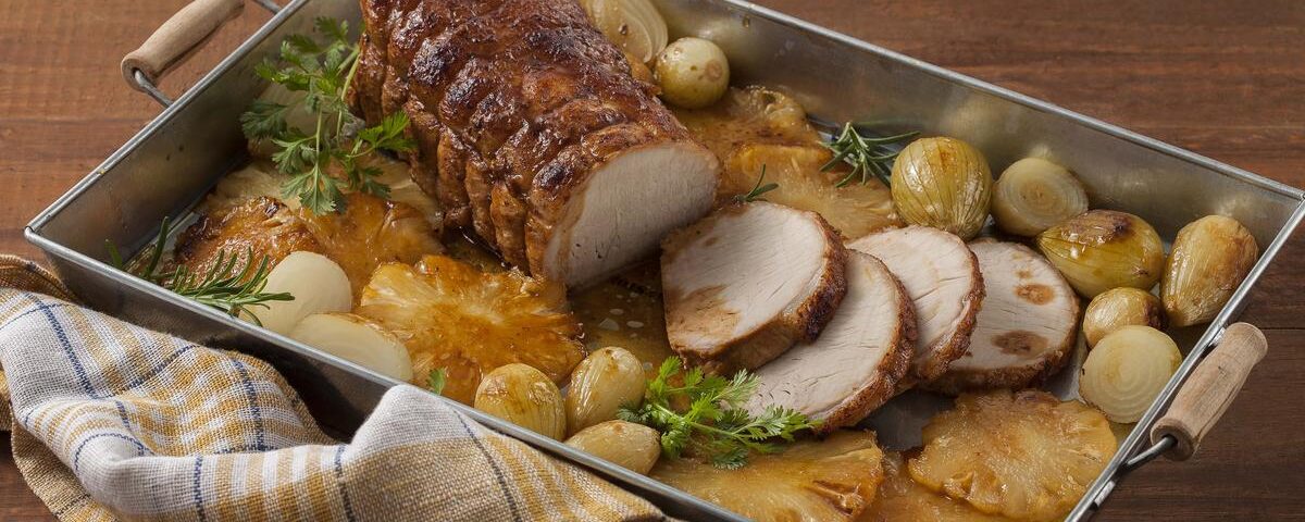 Ingredientes: 2 quilos de lombo de porco; 3 colheres (sopa) de Maggi Grill; 2 xícaras (chá) de vinho branco seco; suco de 2 limões; 1 xícara (chá) de açúcar; 1 abacaxi em rodelas e 250g de mini cebolas.