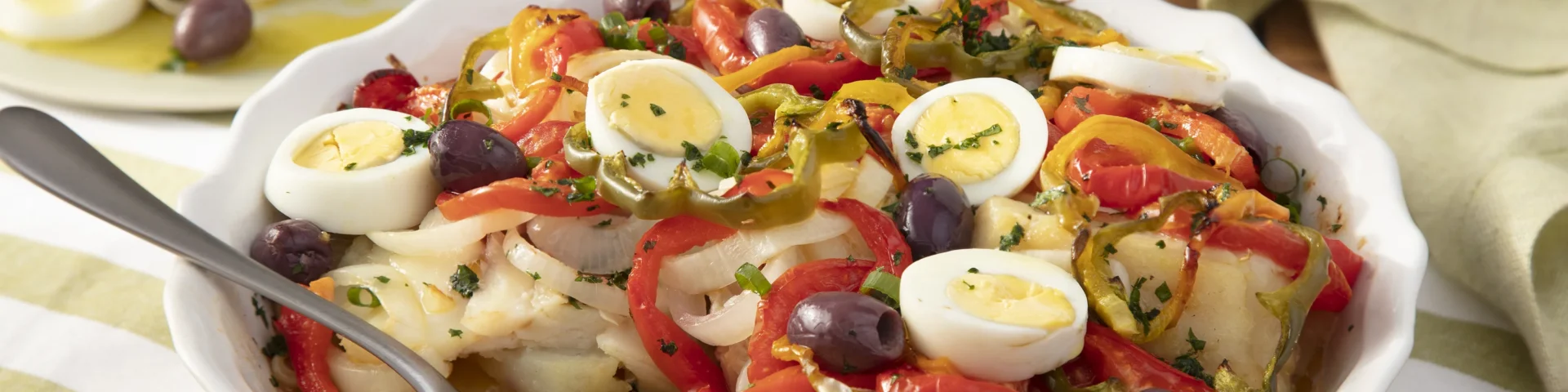 Ingredientes: 800g de bacalhau em postas, dessalgado; 1 kg de batatas em rodelas, cozidas; 1 fio de azeite; 2 colheres (sopa) de Maggi Fondor; 3 cebolas em rodelas; 4 tomates em rodelas; meio pimentão vermelho em rodelas; meio pimentão verde em rodelas; meio pimentão amarelo em rodelas; 1 xícara (chá) de azeite; 1 pitada de pimenta-do-reino; meia colher (chá) de sal; 4 ovos cozidos, cortados ao meio; 1 xícara (chá) de azeitonas pretas e 2 colheres (sopa) de cheiro-verde picado.