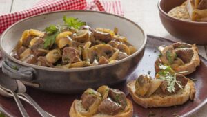 Ingredientes: 1 colher (sopa) de azeite; 500g de alcatra em cubos pequenos; 1 sachê de MAGGi Meu Segredo Refoga; 1 cebola em fatias; meia xícara (chá) de suco de laranja; 1 colher (sopa) de farinha de trigo; meia xícara (chá) de champignons fatiados; 2 colheres (sopa) de cheiro-verde.