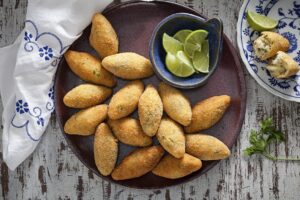 Ingredientes: 150g de bacalhau dessalgado e desfiado; 1 batata grande cozida e amassada; 1 gema; 1 colher (chá) de MAGGI Fondor; 2 colheres (sopa) de salsa picada; meia xícara (chá) de farinha de trigo; 4 colheres (sopa) de requeijão NESTLÉ; 1 ovo; 1 pitada de sal; meia xícara (chá) de farinha de rosca.