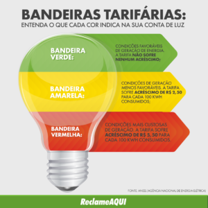 Quando a conta de luz é calculada pela bandeira verde, não há nenhum acréscimo. Quando são aplicadas as bandeiras vermelha ou amarela, a conta sofre acréscimos, que variam de R$ 2,989 (bandeira amarela) a R$ 9,795 (bandeira vermelha patamar 2) a cada 100 quilowatts-hora (kWh) consumidos. Quando a bandeira de escassez hídrica vigorou de setembro de 2021 a 15 de abril de 2022, o consumidor pagava R$ 14,20 extras a cada 100 kWh.