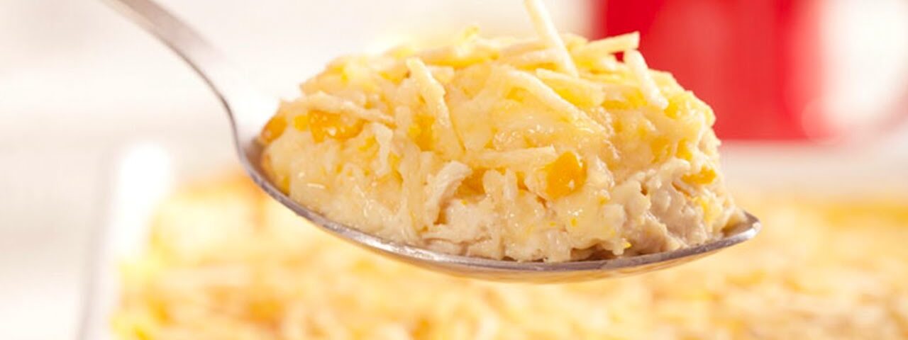 Ingredientes: 1 colher (sopa) de manteiga; 1 peito de frango cozido e desfiado; 2 tabletes de caldo de galinha MAGGI; meia xícara (chá) de água quente; 1 lata de creme de leite NESTLÉ; 1 lata de milho-verde escorrida; 2 xícaras (chá) de leite líquido NINHO Forti+ Integral; 2 colheres (sopa) de amido de milho; 1 xícara (chá) de queijo mozarela ralado e 1 xícara (chá) de batata palha.