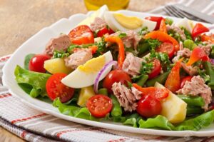 Ingredientes: 3 latas de atum ralado ao natural; 1 pé de alface; 3 tomates médios picados; 1 cebola pequena picada; 1 colher (café) de alho amassado; vinagre; azeite; salsinha; cebolinha; sal e limão.
