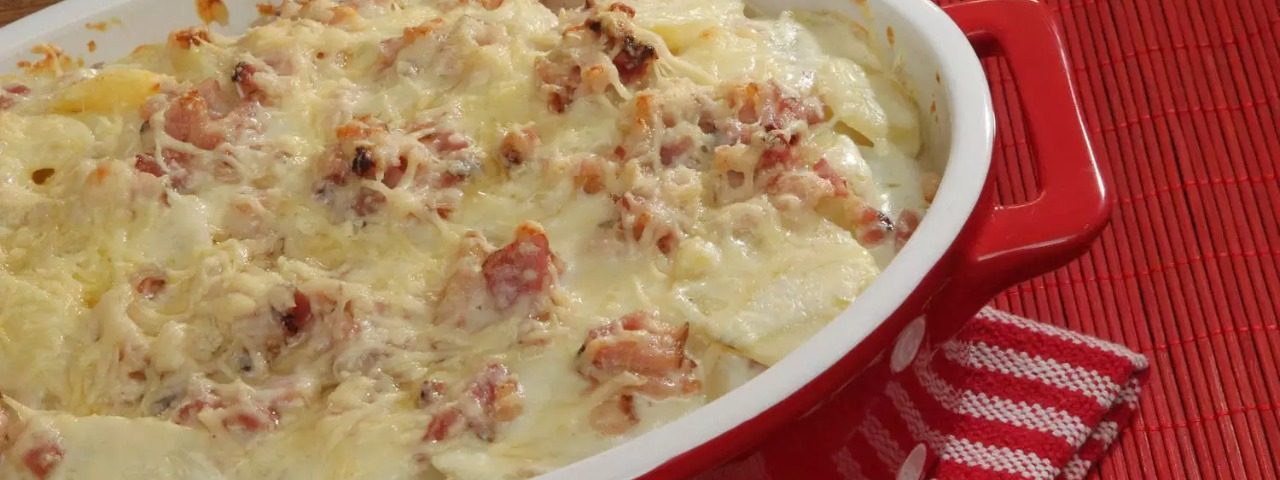 Ingredientes: 8 batatas grandes; 1 caldo de galinha; 400g de bacon; 1 cebola pequena e coentro. Para o molho branco: 1 colher (sopa) de margarina; 1 cebola picada; meio litro de leite; 1 colher (sopa) cheia de maisena e queijo ralado (se preferir).