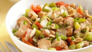 Ingredientes: 2 colheres (sopa) de azeite de oliva; 2 cebolas médias cortadas em cubos; 2 dentes de alho esmagados; 500g de filé de frango sem pele e cortado em cubos; sal a gosto; 1 pimentão verde cortado em cubos; 1 pimentão vermelho cortado em cubos; 1 pimentão amarelo cortado em cubos; 1 xícara (chá) de cogumelos em conserva cortados ao meio; 1/4 xícara de molho shoyu; 1 colher (sopa) de maisena; 1/2 xícara (chá) de água e 2 colheres (sopa) de amendoim torrado.