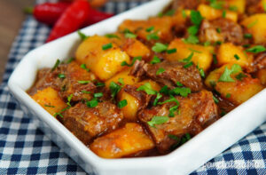 Ingredientes: 1,5 kg de costela bovina; 1 kg de mandioca crua (descascada e cortada em cubos); sal a gosto; 2 colheres (sopa) de vinagre; 2 colheres (sopa) de óleo; 4 dentes de alho picados. 1/2 pimenta dedo de moça picada e sem sementes (opcional); 1 cebola média picada; 1 colher (chá) de colorau; 1/2 pimentão picado; 1 tomate picado; 2 colheres (sopa) de molho de tomate; cheiro verde e pimenta do reino a gosto e água quente (o suficiente para cobrir a carne).